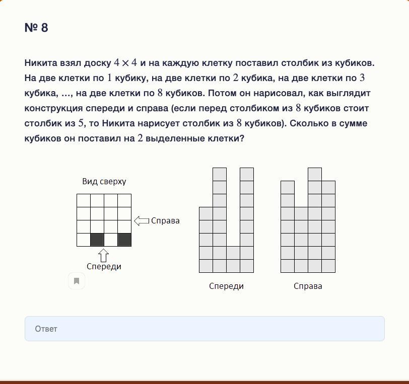 Никита взял доску 4×4 и на каждую клетку поставил столбик из кубиков. На две клетки по 1 кубику, на две клетки по 2 кубика, на две клетки по 3 кубика, …, на две клетки по 8 кубиков. Потом он нарисовал, как выглядит конструкция спереди и справа (если перед столбиком из 8 кубиков стоит столбик из 5, то Никита нарисует столбик из 8 кубиков). Сколько в сумме кубиков он поставил на 2 выделенные клетки?