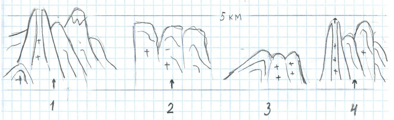 Задание: Вам предложено 4 схематичных изображения гор России (Урал, Кавказ, горы Южной Сибири и горы Дальнего Востока). По предложенным схемам (они пронумерованы), определить горы России. Ответ необходимо обосновать. Из предложенного списка выберите особенности, характерные для каждого из этих природных районов.