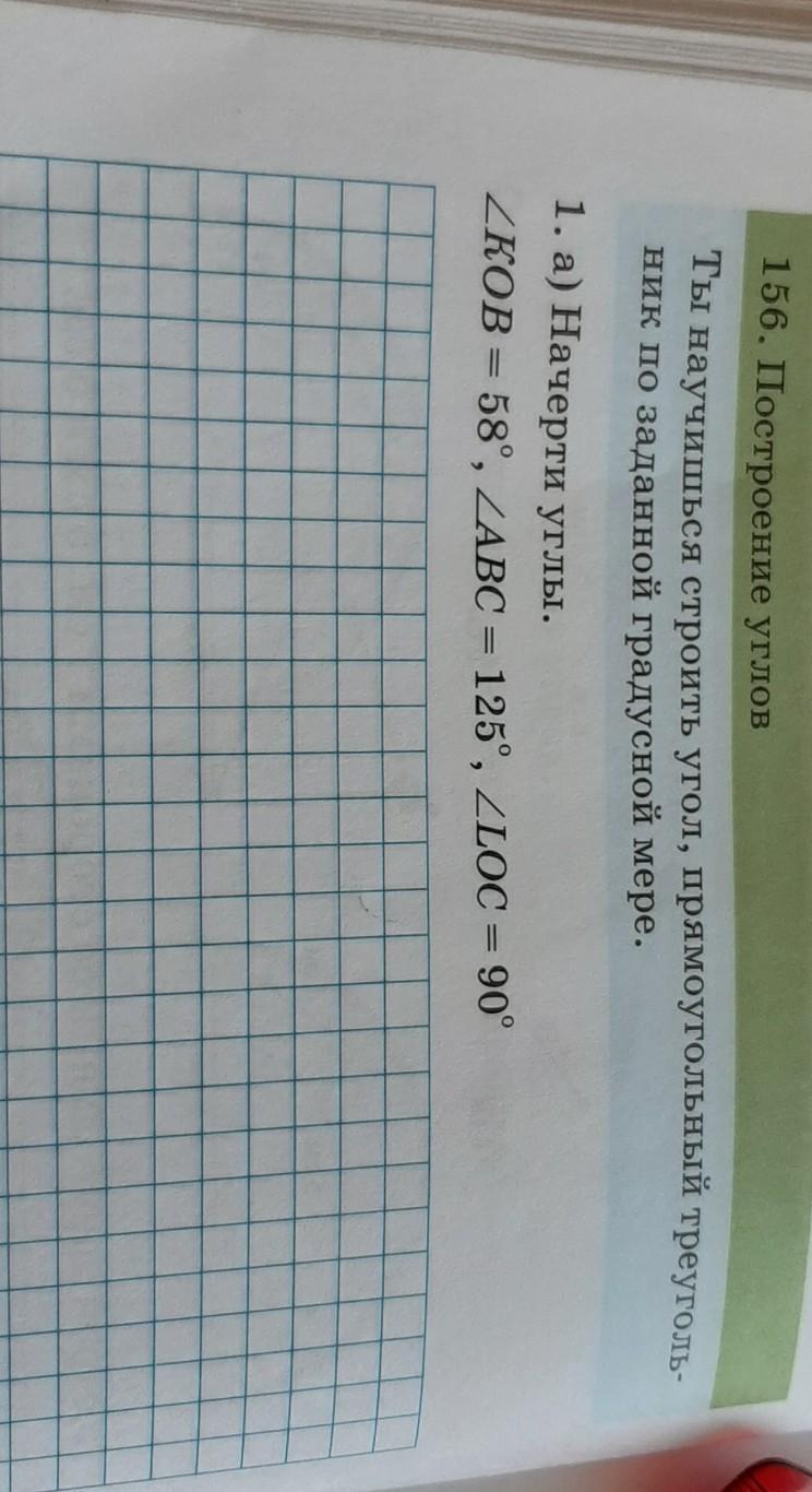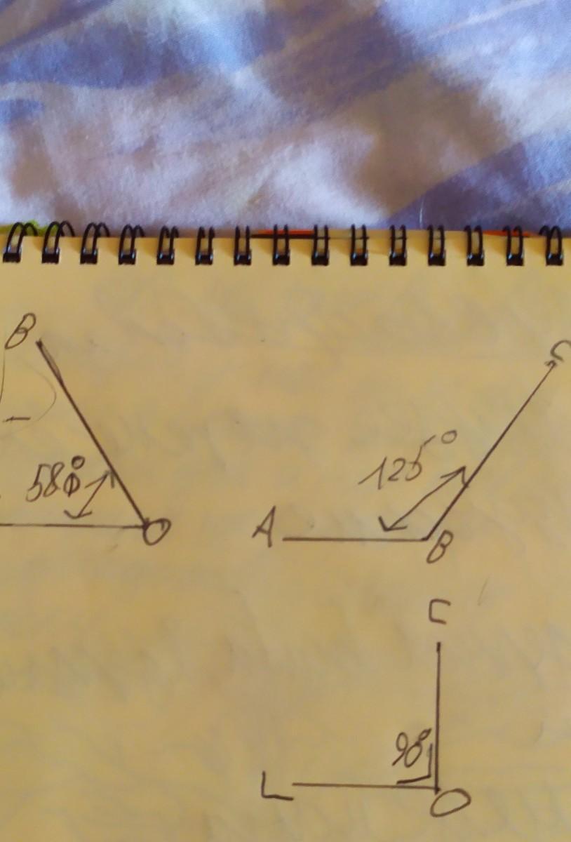 Начерти углы.<КОВ=58°,<АВС=125°,<LOC=90°.