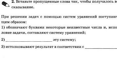 Вставьте пропущенные слова так, чтобы получилось верное высказывание. при решении задач с помощью систем уравнений поступают следующим образом: 1) обозначают буквами некоторые неизвестные числа и, используют условие задачи, составляют систему задач;