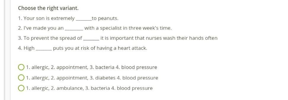 Ответ:allergist , 2 bacteria 3 appointment 4 blood pressure