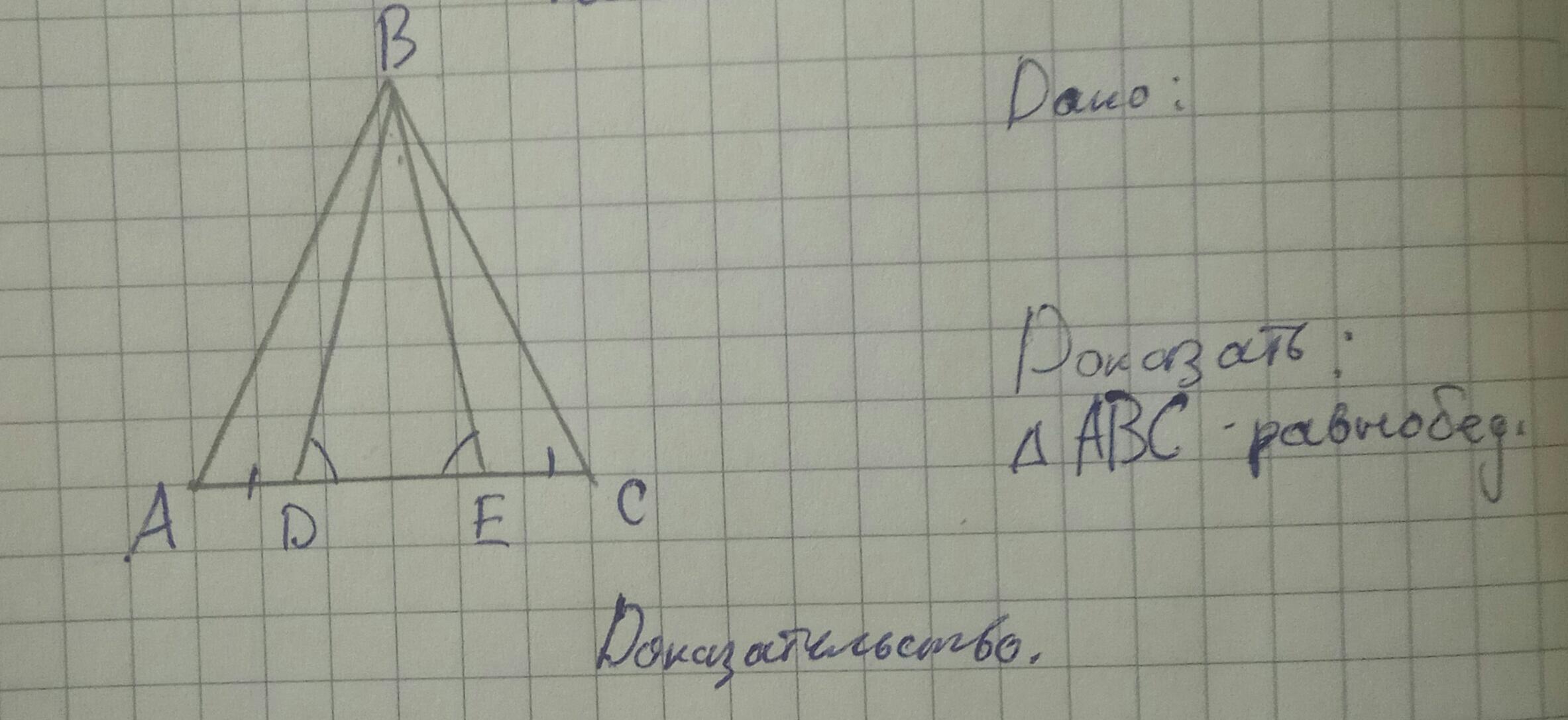 угол АDВ = углу ВЕС (т.к. угол ВDЕ = углу ВЕD) => треугольник АВD = треугольнику ВСЕ ( по двум сторонам и углу между ними) => АВ =ВС => треугольник АВС равнобедренный
