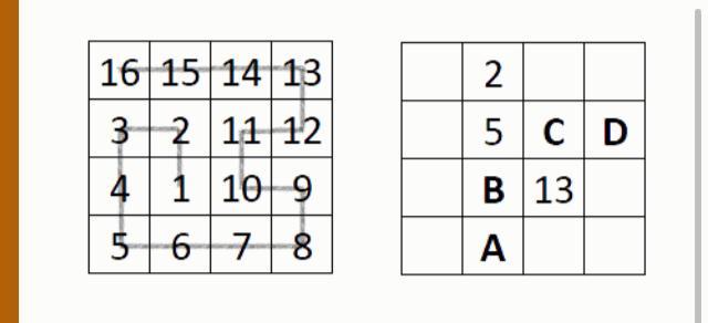 Ксюша поставила фишку в одну из клеток квадрата 4×4. Она передвигала фишку по клеткам этого квадрата, каждый раз переходя из клетки в соседнюю по стороне, и побывала в каждой клетке ровно один раз. В каждую клетку она записала номер хода, на котором фишка попадала в данную клетку (рисунок слева). Она сделала так ещё раз, но записала только 3 хода (рисунок справа). Найдите, какие числа должны стоять в отмеченных клетках.