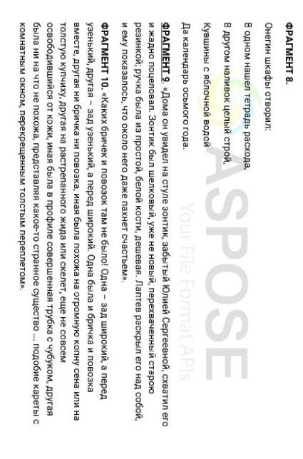 ФРАГМЕНТ 1. «На бюро ... лежало множество всякой всячины: куча исписанных мелко бумажек, накрытых мраморным позеленевшим прессом с яичком наверху, какая-то старинная книга в кожаном переплете с красным обрезом, лимон, весь высохший, ростом не более лесного ореха, отломленная ручка кресел, рюмка с какой-то жидкостью и тремя мухами, накрытая письмом, кусочек сургучика, кусочек где-то поднятой тряпки, два пера, запачканные чернилами, высохшие, как в чахотке, зубочистка, совершенно пожелтевшая». ФРАГМЕНТ 2. «..на нем было коротенькое пальто бранзового цвета розовый галстучек с лиловыми кончиками и бархатный черный картуз с золотым галуном. Круглые воротнички его белой рубашки немилосердно подпирали ему уши и резали щеки, а накрахмаленные рукавчики закрывали всю руку вплоть до красных и кривых пальцев, украшенных серебряными и золотыми кольцами с незабудками из бирюзы». ФРАГМЕНТ 3. Глаза, как небо, голубые, Улыбка, локоны льняные, Движенья, голос, легкий стан, Все в Ольг... но любой роман Возьмите, и найдете, верно, портрет: он очень мил, Я прежде сам его любил, Но надоел он мне безмерно. ФРАГМЕНТ 4. «И в этих немигающих глазах, и в маленькой голове на длинной шее, ее стройности было что-то змеиное; зеленая, с желтой грудью, с улыбкой, она глядела,как весной из молодой ржи глядит на прохожего гадюка, вытянувшись и подняв голову». ФРАГМЕНТ 5. «Лицо его как будто дверью прищемлено или мокрой тряпкой прибито» ФРАГМЕНТ 6. «Она никак не могла бы выразить тот ход мыслей, который заставил ее улыбаться; но последний вывод был тот, что муж ее, восхищающийся братом и уничтожающий себя перед ним, был неискренен. Кити знала, что эта неискренность его происходила от любви к брату, от чувства совестливости за то, что он слишком счастлив, и в особенности от неоставляющего его желания быть лучше, -она любила это в нем и потому улыбалась». ФРАГМЕНТ 7. «(Николай Петрович) не в силах был расстаться с темнотой, с садом, с ощущением свежего воздуха на лице и с этой грустию, с этой тревогой.. Павел Петрович дошел до конца сада, и тоже задумался, и тоже поднял глаза к небу. Но в его прекрасных темных глазах не отразилось ничего, кроме света звезд. Он не был рожден романтиком, и не умела мечтать его щегольски-сухая и страстная, на французский лад мизантропическая душа». ФРАГМЕНТ 8. Онегин шкафы отворил: В одном нашел тетрадь расхода, ASPOSE В другом наливок целый строй, Кувшины с яблочной водой Да календарь осьмого года. ФРАГМЕНТ 9. «Дома он увидел на стуле зонтик, забытый Юлией Сергеевной, схватил его и жадно поцеловал. Зонтик был шелковый, уже не новый, перехваченный старою резинкой; ручка была из простой, белой кости, дешевая. Лаптев раскрыл его над собой, и ему показалось, что около него даже пахнет счастьем». ФРАГМЕНТ 10. «Каких бричек и повозок там не было! Одна- зад широкий, а перед узенький, другая зад узенький, а перед широкий. Одна была и бричка и повозка вместе, другая ни бричка ни повозка, иная была похожа на огромную копну сена или на толстую купчиху, другая на растрепанного жида или скелет, еще не совсем освободившийся от кожи, иная была в профиле совершенная трубка с чубуком, другая была ни на что не похожа, представляя какое-то странное существо.. подобие кареты с комнатным окном, перекрещенным толстым переплетом».