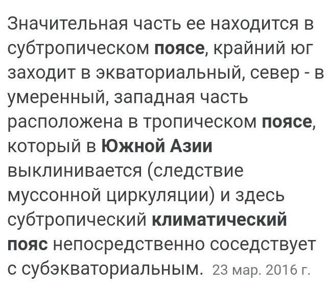 Значительная часть её находится в субтропическом поясе, крайний юг заходит в экваториальный, север-в умеренный, западная часть расположена в тропическом поясе, который в Южной Азии выклинивается (следствие муссонной циркуляции) и здесь субтропический климатический пояс непосредственно соседствует с субэкваториальным.