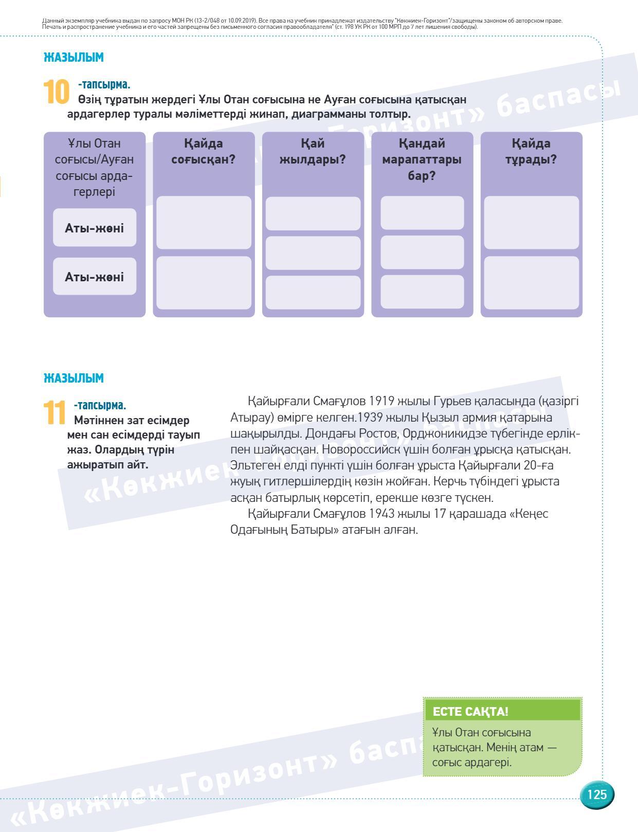 11-тапсырма 125 бет. Мәтіннен зат есімдер мен сан есімдерді тауып жаз. Олардың түрін ажырытып