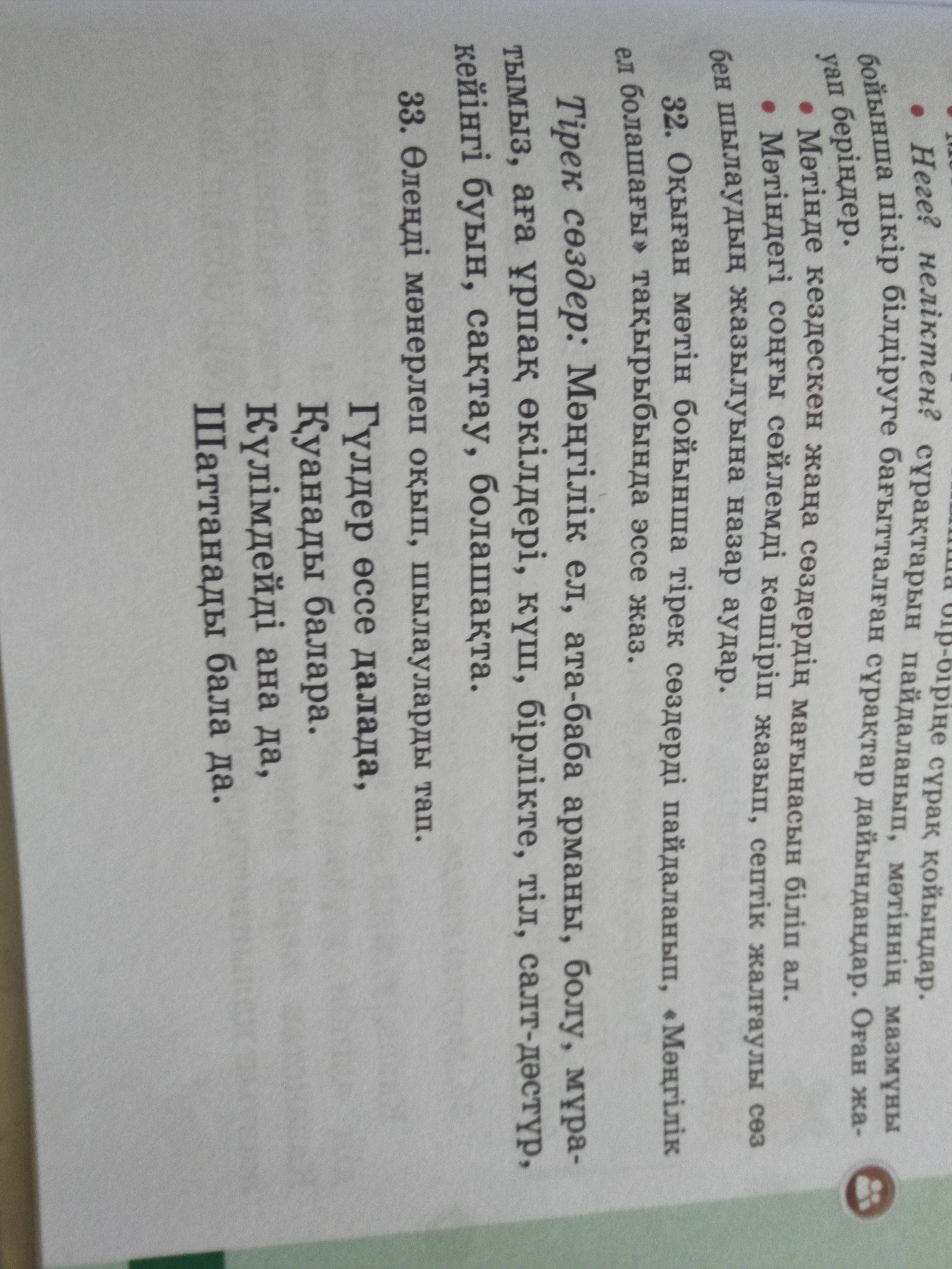 Қазіргі Қазақ елі - Мәңгілік ел, тәуелсіз мемлекет. Қазіргі еліміздің тәуелсіз болуы, мәңгілік ел болуы ата-баба арманы болған еді. Және де біздің осынау бейбіт өмір сүруімізде ата баба арқасы. Мәңгілік ел болуымыздың тағы бір себебі - қазақ халқының бірлігінде, күшінде, салт-дәстүрінде, қастерлі тілінде. Бұның бәрі біздің мұратымыз,байлығымыз. Ендігі біздің осы байлығымызды болашақта сақтау кейінгі буын мойныңда. Мәңгілік ел болашағы - жастар, жерімізді гүлдендіретін де түрлендіретін де осы жастар.