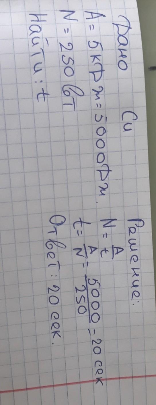 ЗА КАКОЕ ВРЕМЯ ПОДЪЁМНЫЙ КРАН СОВЕРШИТ РАБОТУ 5 КДЖ, ЕСЛИ ЕГО МОЩНОСТЬ РАВНА 250 ВТ?Со Словами дано, найти, решение, вычисление!!!!!!