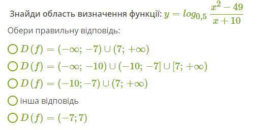 Знайди область визначення функції: y=log0,5x2−49x+10