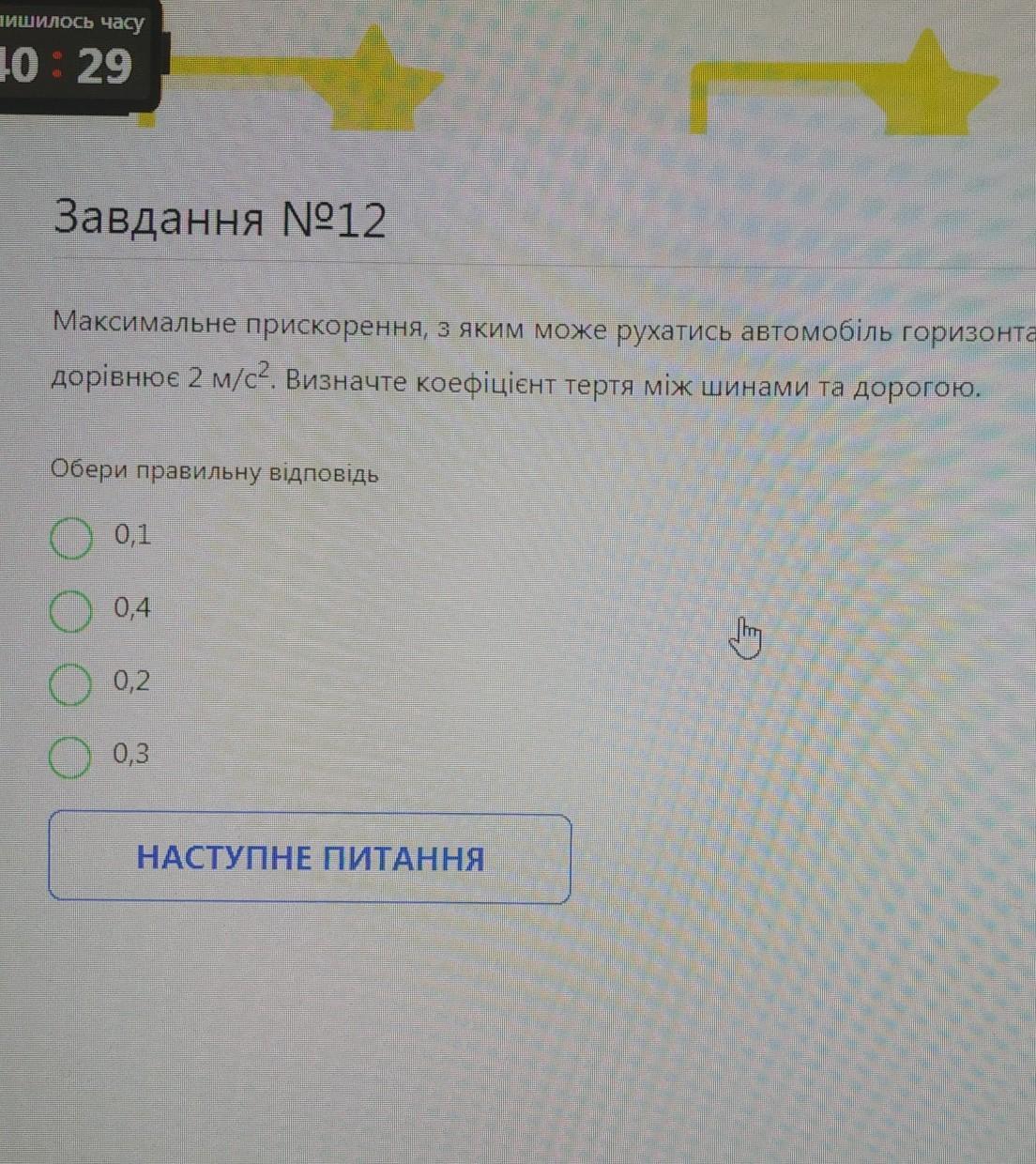 дорівнює 2 м/с2. Визначте коефіцієнт тертя між шинами та дорогою.