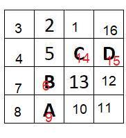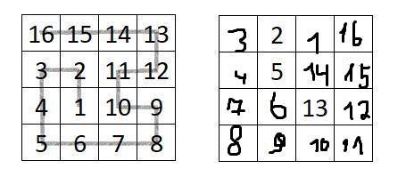 Ксюша поставила фишку в одну из клеток квадрата 4×4. Она передвигала фишку по клеткам этого квадрата, каждый раз переходя из клетки в соседнюю по стороне, и побывала в каждой клетке ровно один раз. В каждую клетку она записала номер хода, на котором фишка попадала в данную клетку (рисунок слева). Она сделала так ещё раз, но записала только 3 хода (рисунок справа). Найдите, какие числа должны стоять в отмеченных клетках.