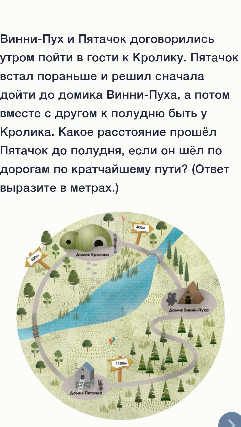 напрямую у Винни Пуху путь занимает 1100 м. Путь к Винни Пуху через дом кролика 1000 м. Если Пятачок шёл кратчайшим путём, то весь путь составлял 1000+400 т.к. нужно прийти обратно к кролику. Весь путь составлял 1400 м