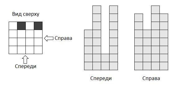 Никита взял доску 4×4 и на каждую клетку поставил столбик из кубиков. На две клетки по 1 кубику, на две клетки по 2 кубика, на две клетки по 3 кубика, …, на две клетки по 8 кубиков. Потом он нарисовал, как выглядит конструкция спереди и справа (если перед столбиком из 8 кубиков стоит столбик из 5, то Никита нарисует столбик из 8 кубиков). Сколько в сумме кубиков он поставил на 2 выделенные клетки?