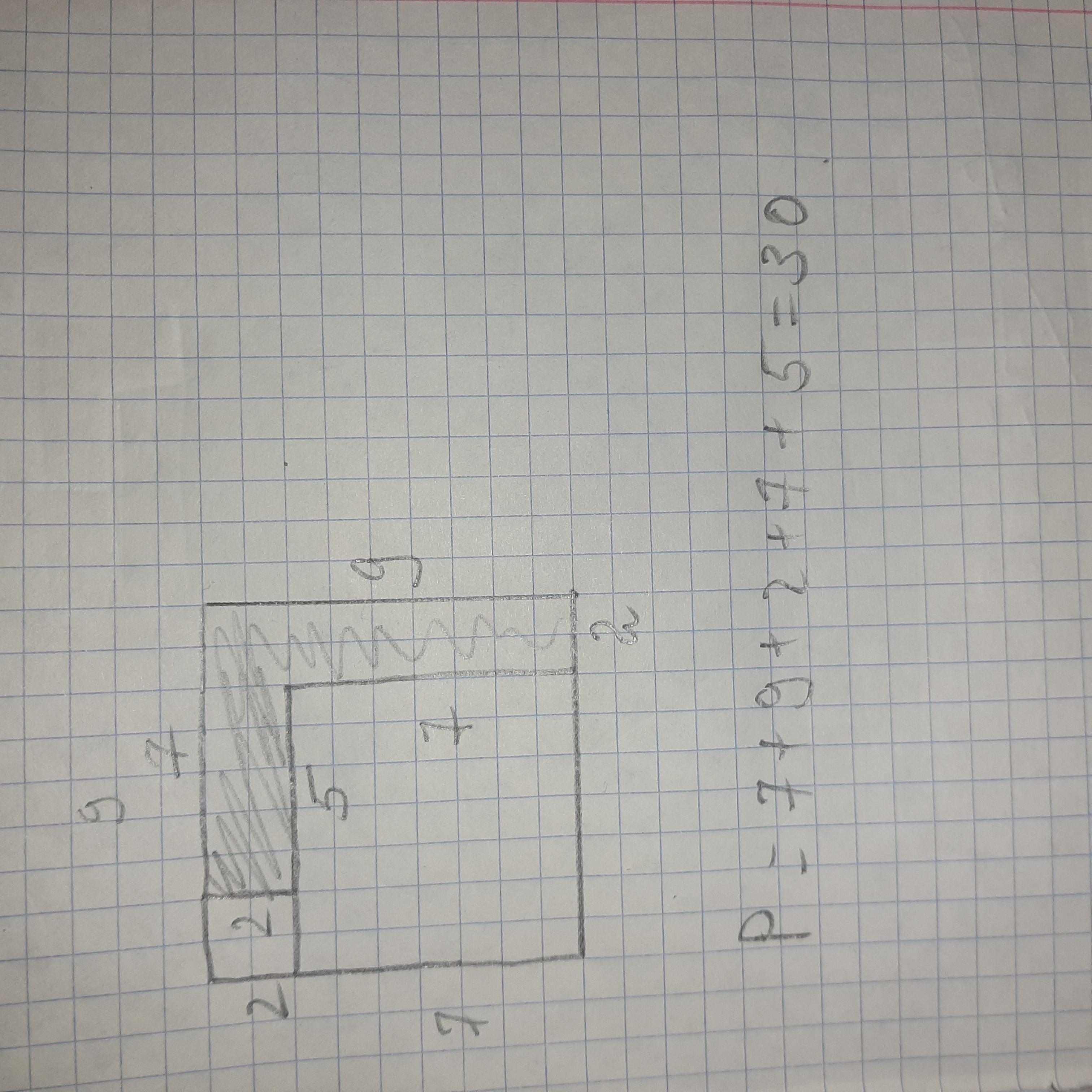 Из квадрата со стороной 9 вырезали зелёный квадрат со стороной 2, синий квадрат и жёлтый прямоугольник (см. рисунок). Чему равен периметр оставшейся фигуры?