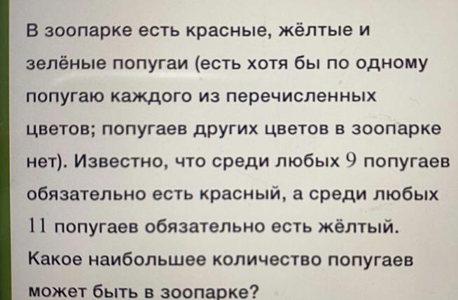 Из 9 попугаев есть 1 красный значит остальные зелёные и жёлтые. Из 11 1 жёлтый, а остальные зелёные и красные.