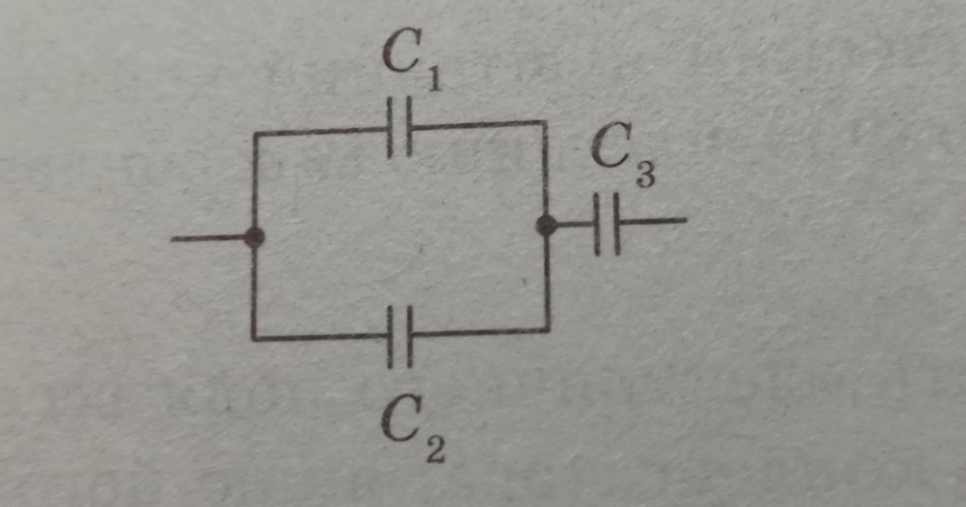 Визначте електроємність батареї конденсаторів (див на рисунок), якщо С1=С2=1000пФ і С3=250пФ