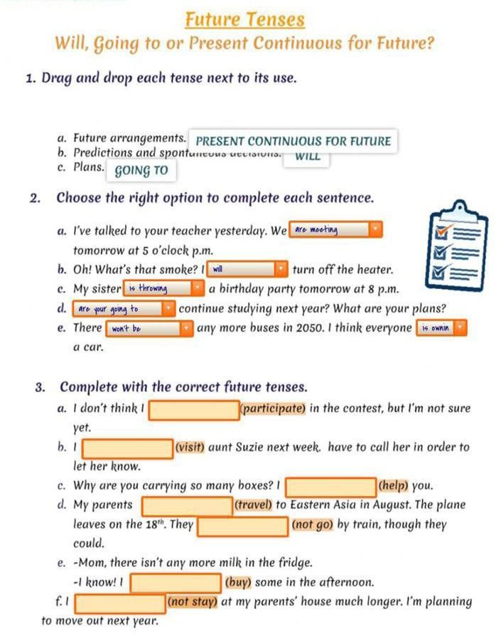 1 will participate 2 will visit 3 will help 4 will travel,will not go 5 will buy 6 will not stay