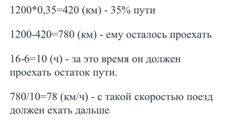 Поезд должен проехать расстояние 1200 км за 16 часов. Оказалось, что первые 35% пути он преодолел за 6 часов. С какой скоростью ему надо двигаться дальше, чтобы прибыть в пункт назначения вовремя?