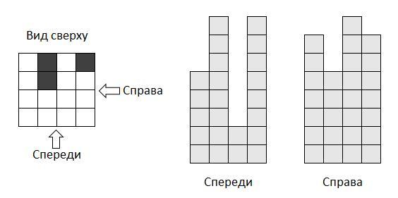 Никита взял доску 4×4 и на каждую клетку поставил столбик из кубиков. На две клетки по 1 кубику, на две клетки по 2 кубика, на две клетки по 3 кубика, …, на две клетки по 8 кубиков. Потом он нарисовал, как выглядит конструкция спереди и справа (если перед столбиком из 8 кубиков стоит столбик из 5, то Никита нарисует столбик из 8 кубиков). Сколько в сумме кубиков он поставил на 3 выделенные клетки?
