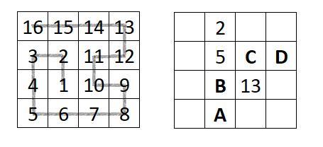 Ксюша поставила фишку в одну из клеток квадрата 4×4. Она передвигала фишку по клеткам этого квадрата, каждый раз переходя из клетки в соседнюю по стороне, и побывала в каждой клетке ровно один раз. В каждую клетку она записала номер хода, на котором фишка попадала в данную клетку (рисунок слева). Она сделала так ещё раз, но записала только 3 хода (рисунок справа). Найдите, какие числа должны стоять в отмеченных клетках.