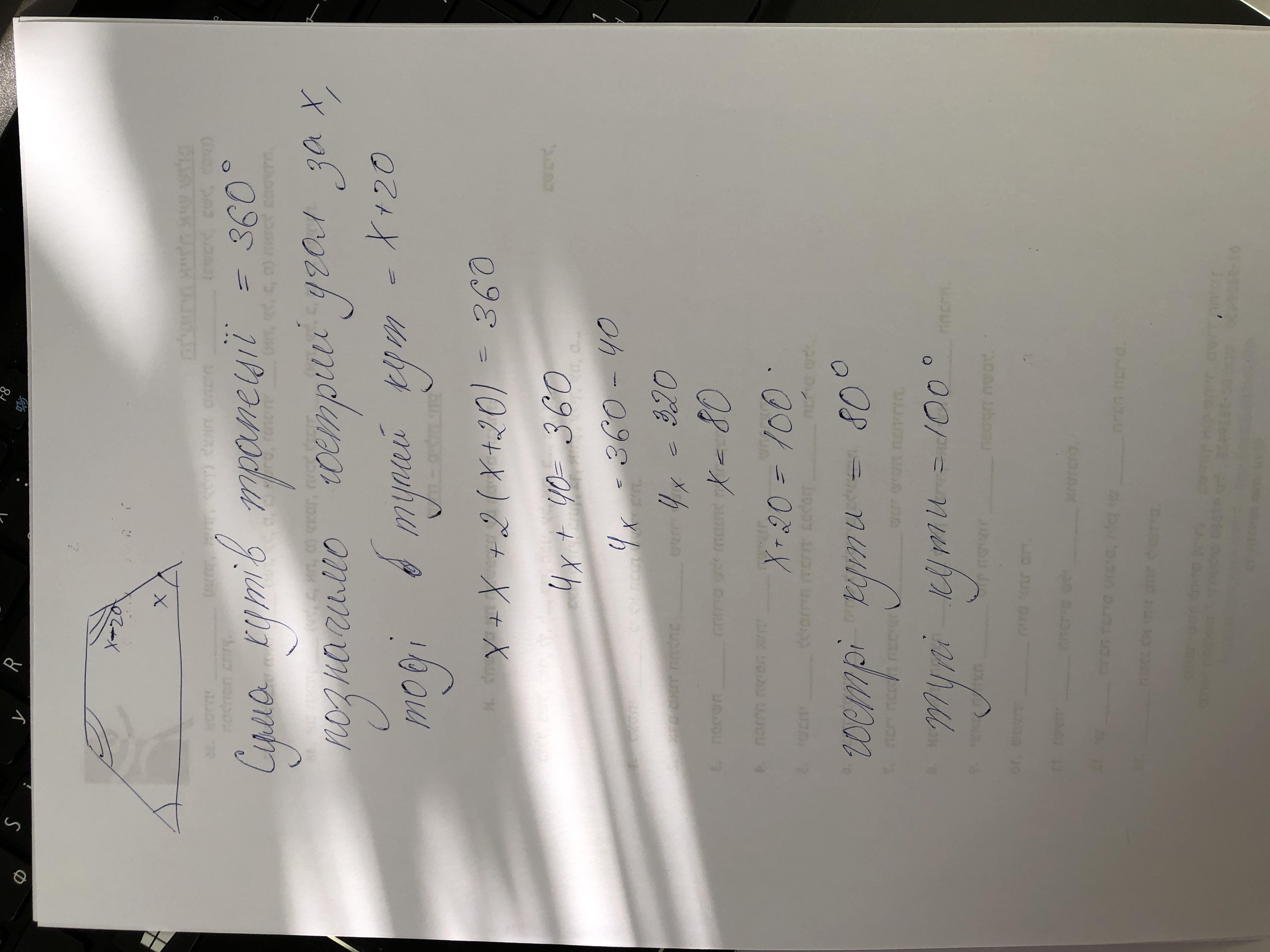 СРОЧНО ДАЮ 30 БАЛОВ , С ОБЪЯСНЕНИЕМ. Тупий кут рівнобічної трапеції на 20 градусів більший від гострого кута. Знайдіть кути цієї трапеції.