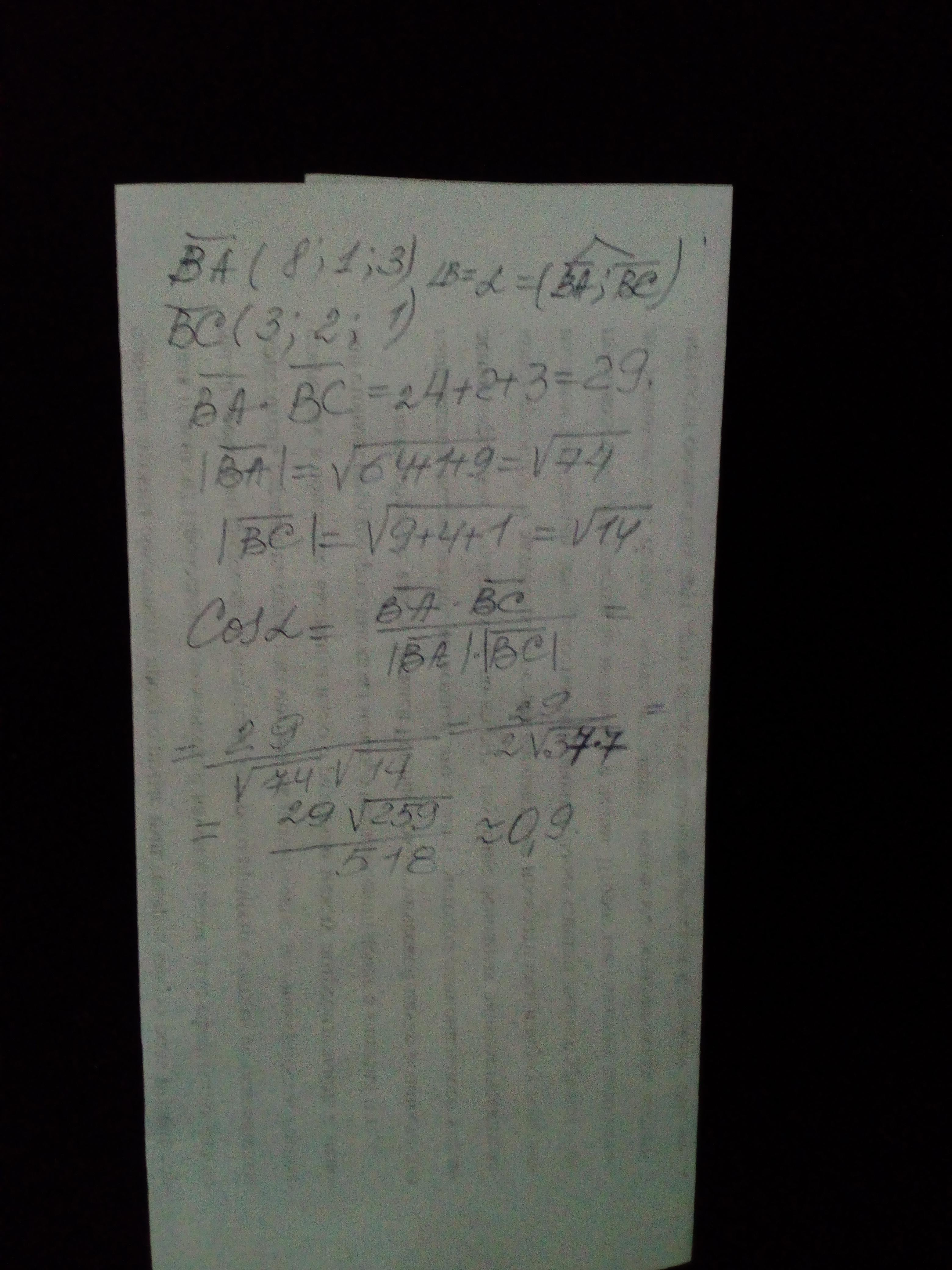 Дано три точки А(3; -2; 4), В(-5; -3; 1), С(-2; -1; 2). Знайти косинус кута В.