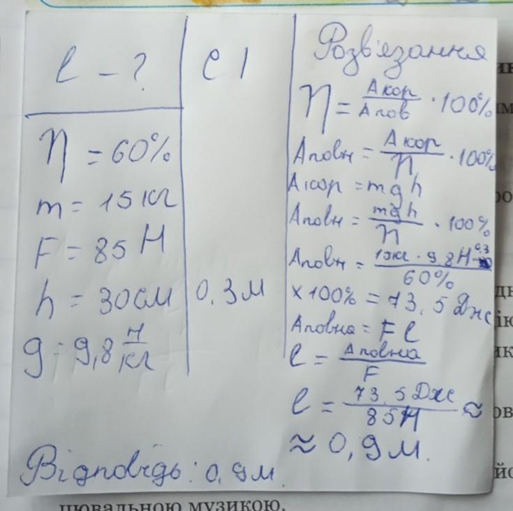 ККД похилої площини становить 60%. Щоб підняти вантаж масою 15 кг, необхідно прикласти силу 85Н. Якою є довжина похилої площини, якщо її висота дорівнює 30см?