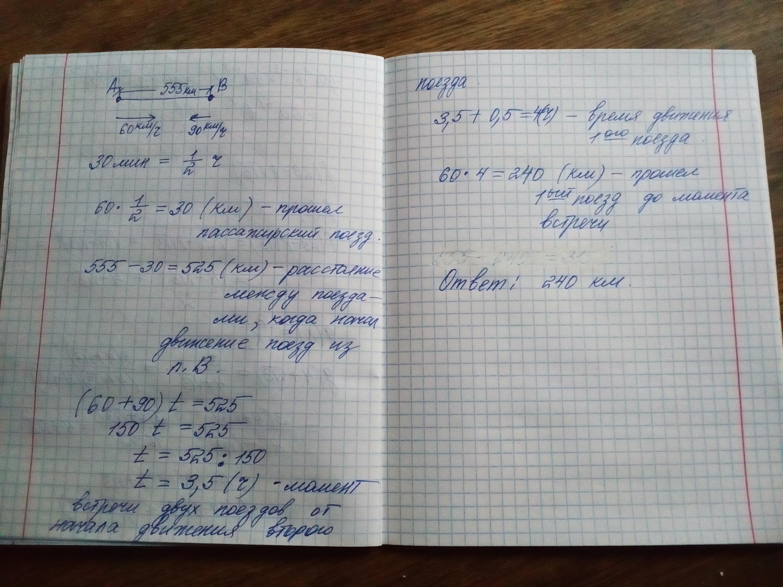 РЕБЯТА! УМОЛЯЮ! ПОМОГИТЕ ПОЖАЛУЙСТА! ПРЯМ СРОЧНО НУЖНО! ФУНКЦИЕЙ РЕШИТЕ ИЛИ УРАВНЕНИЕМ!! З пункти А в пункт В, відстань між якими 555км, вийшов пасажирський потяг, швидкість якого 60км/год. Через 30хв назустріч йому з В вийшов швидкісний потяг з швидкістю 90 км/год. На якій відстані від А потяги зустрінуться?