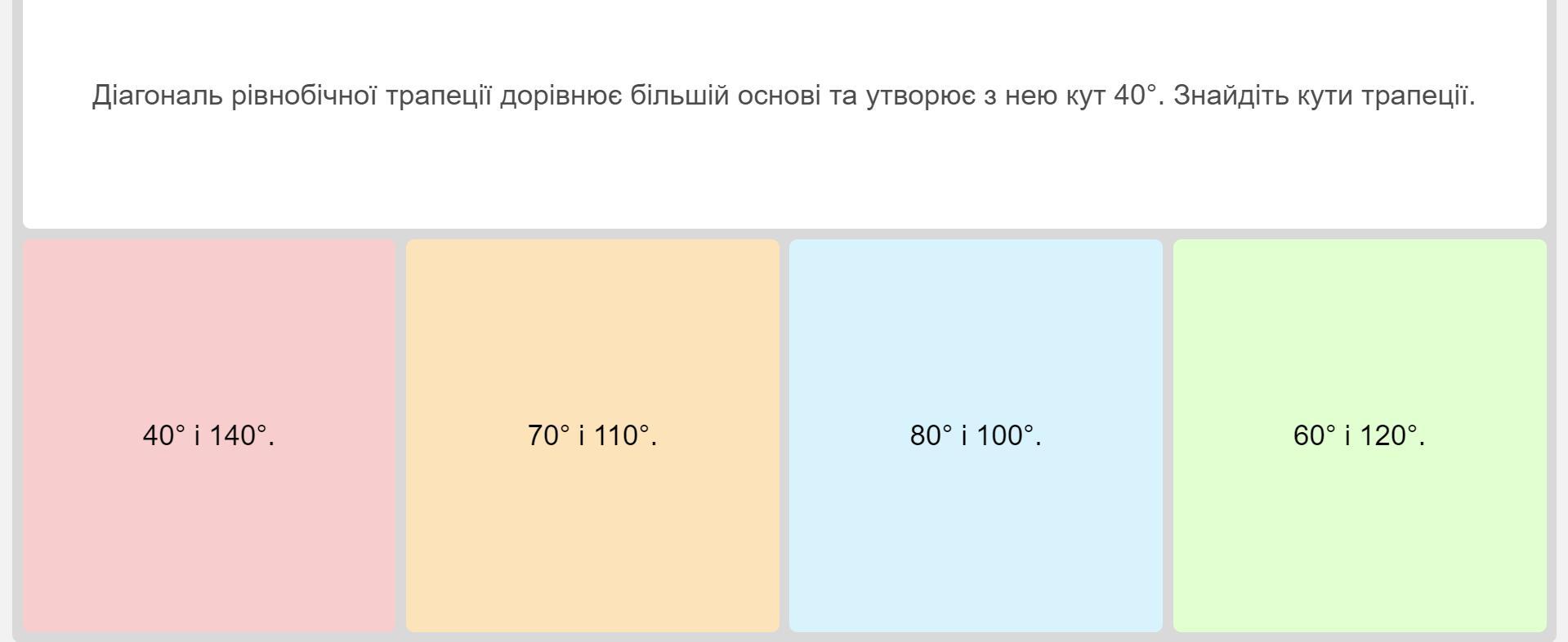 У рівнобічній трапеції діагональ дорівнює більшій основі й утворює з нею кут 40 градусів . знайдіть кути трапеції