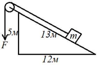 С помощью устройства, изображенного на рисунке, груз массой m = 1кг подняли на высоту 5 метров, прикладывая силу F = 5Н.