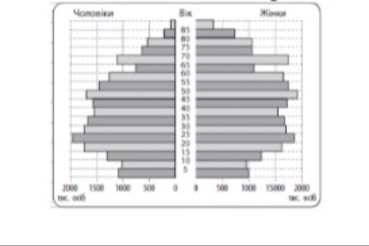 За наведеною статево-віковою пірамідою складіть характеристику демографічної ситуації.Наведіть приклади країн із подібними статево-віковими пірамідами.
