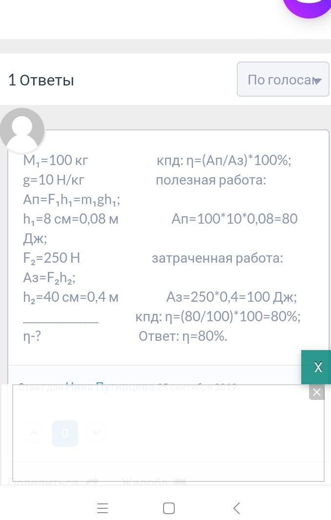 К короткому плечу рычага подвешен груз массой 40 кг. На длинное плечо действуют силой 100 Н, и оно опускается на высоту 30 см. Груз при этом поднялся на высоту 7 см. Найдите коэффициент полезного действия рычага