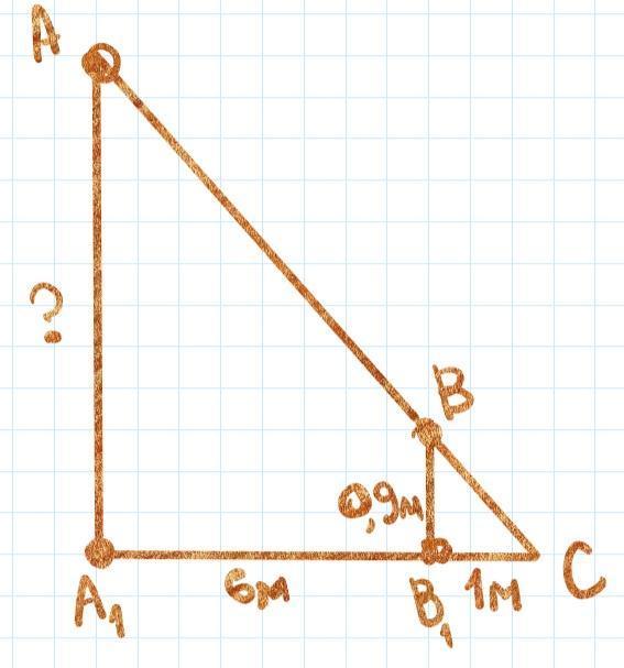 ΔAA₁C подобен ΔBB₁C (по 2-м углам - см. чертеж!) ⇒ AA₁ ÷ BB₁ = A₁C ÷ B₁C ⇒ AA₁ ÷ 0,9 = 7 ÷ 1; AA₁ = 6,3 м