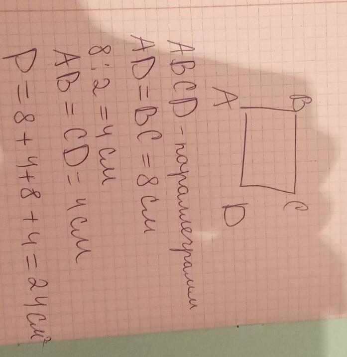 Найди периметр чотирекутника довжина якого 8см, а ширина у 2 рази менша , ніж довжина. Накреси його.
