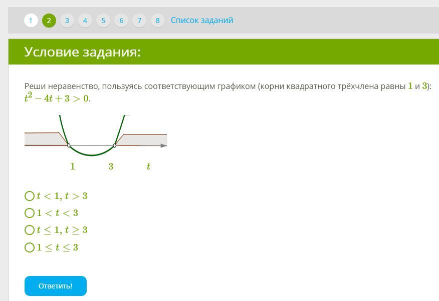 Реши неравенство, пользуясь соответствующим графиком (корни квадратного трёхчлена равны 1 и 3):