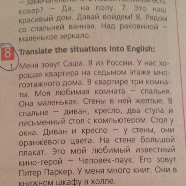 My name is Sasha.I am from Russia.I have got a nice flat on the seventh floor in the building of floors.There are three rooms in my flat.My favourite room is bedroom. It is small. The walls are yellow. There is a sofa, an armchair, two chairs and a desk with a computer. There is a table near the window. The sofa and the chair near the wall, they are yellow.there is a big poster on the wall. It is my favourite geroy a Spider-Man. His name is Peter Parker. I have got a lot of books.they are in a bookcase in the hall.