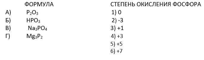 Установите соответствие (буква- цифра) между формулой соединения и степенью окисления атома фосфора в нем