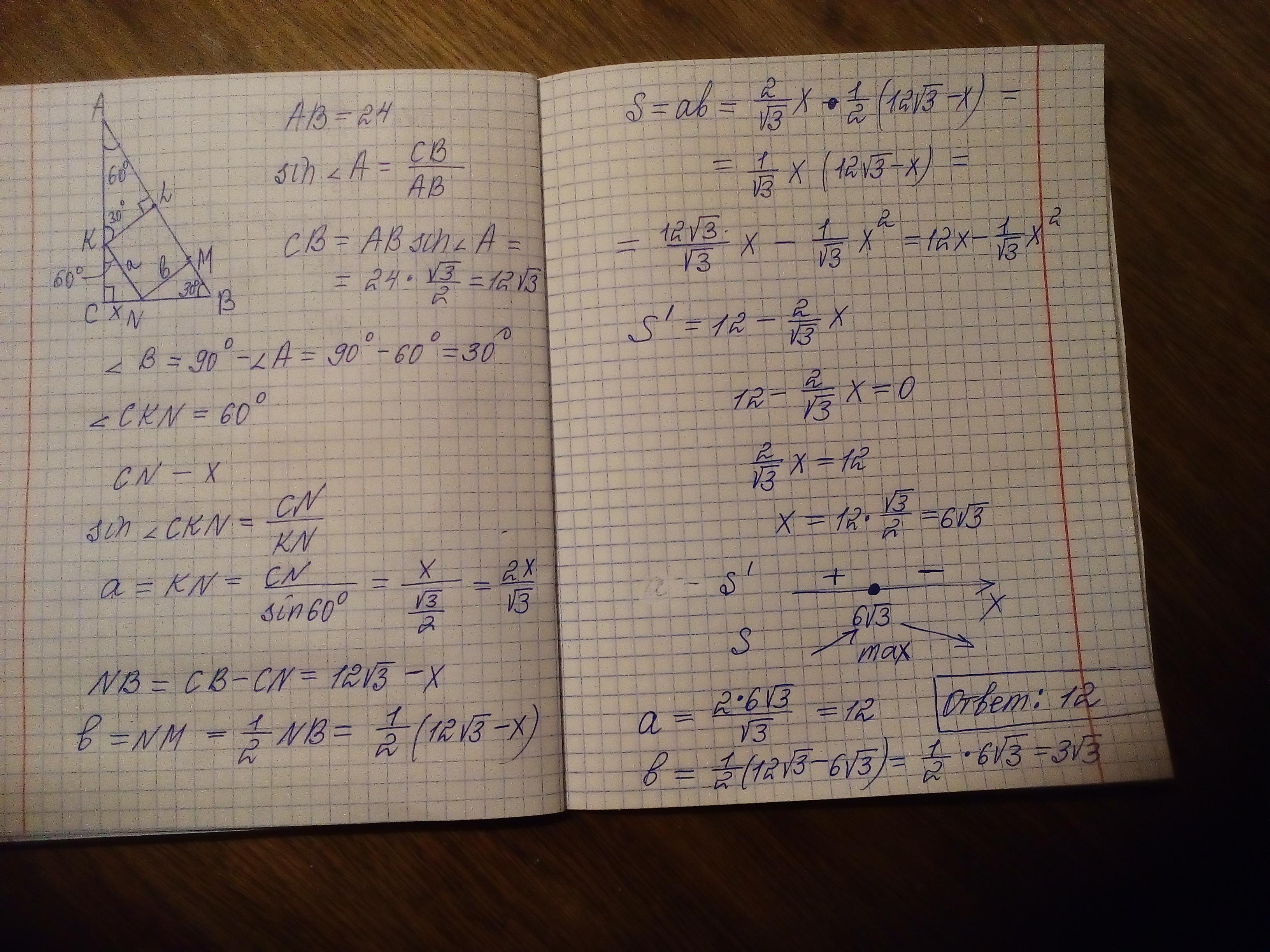 В прямоугольный треугольник, гипотенуза которого равна 24 , а угол 60 , Вписано прямоугольник так, что одна его сторона лежит на гипотенузе. Найдите большую сторону прямоугольника, если известно, что он имеет наибольшую площадь.