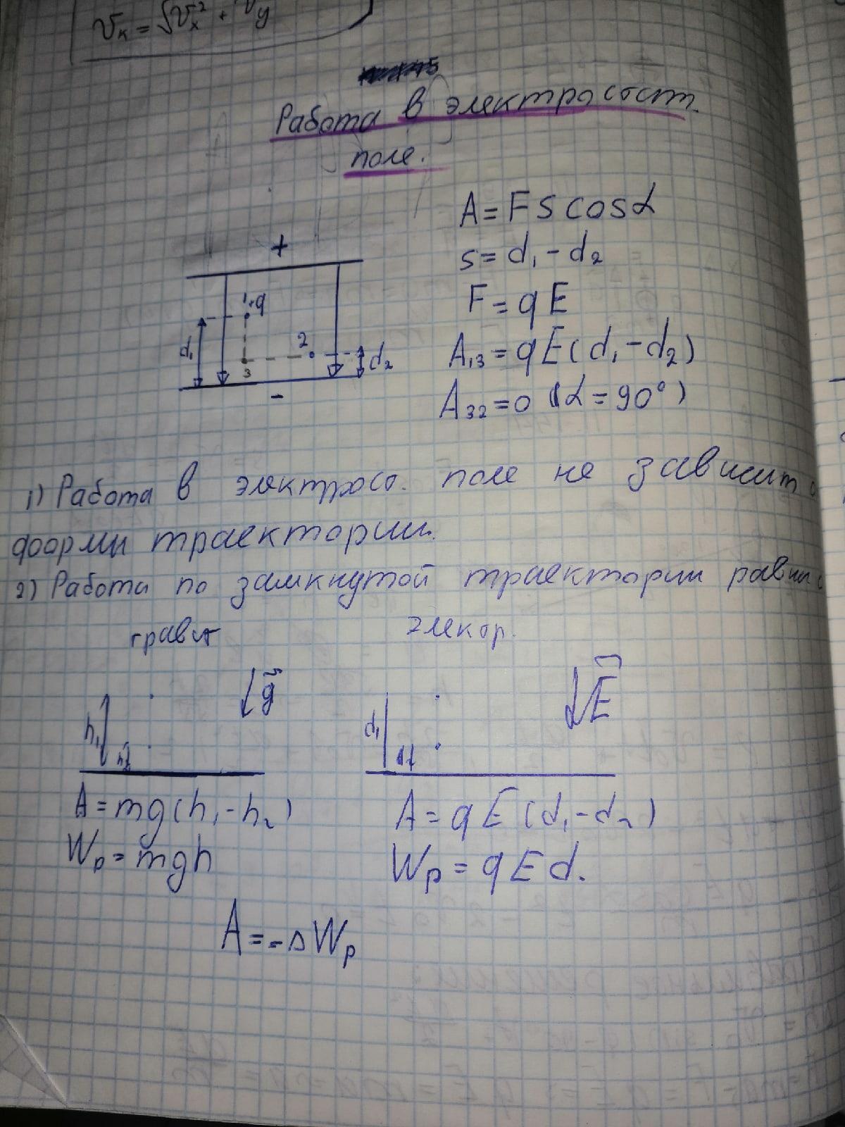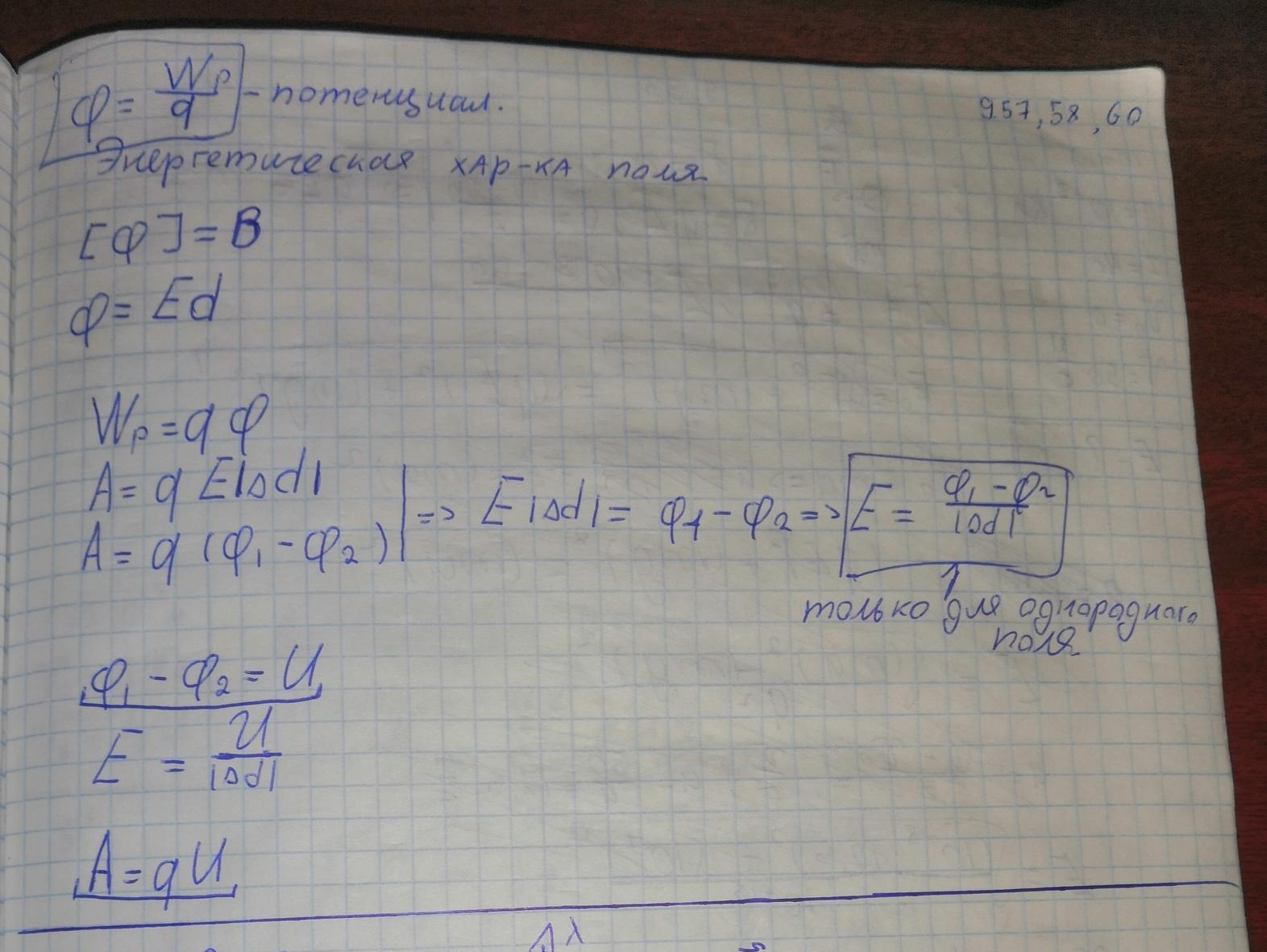 Нужно написать: выводы формул для работы поля по перемещению заряда и потенциальной энергии заряда в поле, а так же определения, формулы и единицы измерения потенциала и разности потенциалов.
