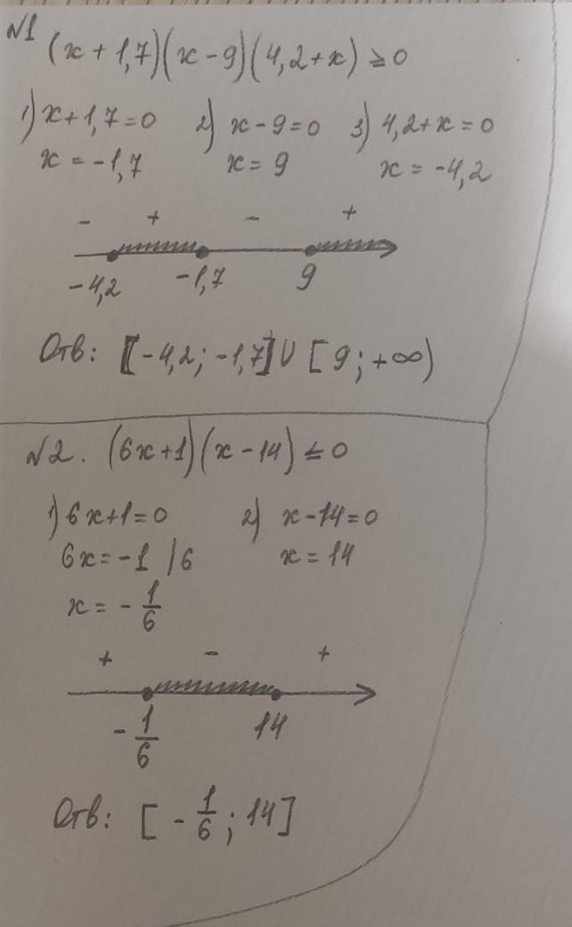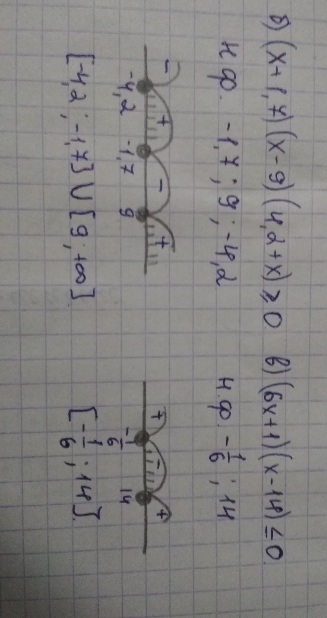 б) (х + 1,7)(х – 9)(4,2 + х) >= 0