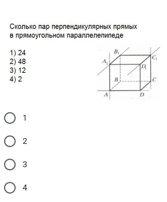сколько пар перпендикулярных прямых в прямоугольном параллелепипеде 1)24 2)48 3)12 4)2. Помогите срочно , через пару часов сдать работу надо
