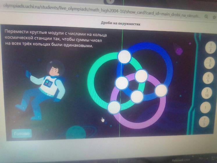 Перемести круглые модули с числами на кольца космической станции так, чтобы суммы чисел на все трёх кольцах были одинаковыми