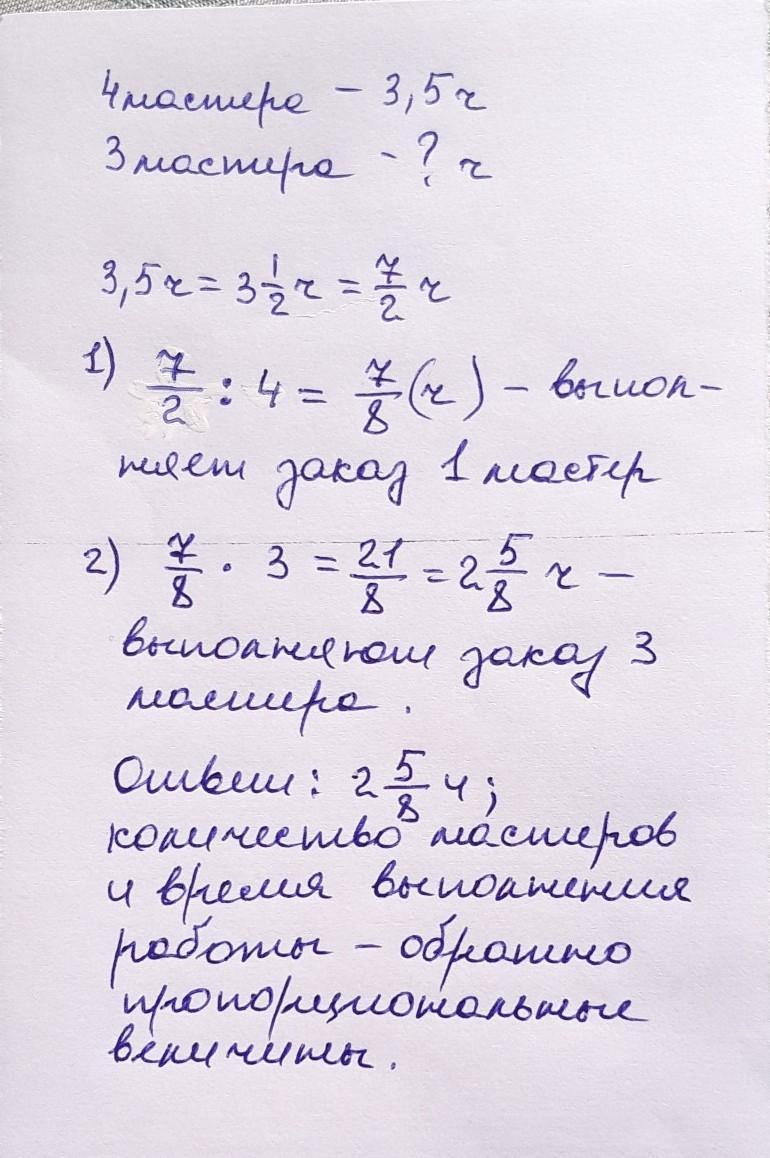 В рекламном агентстве 4 мастера выполнили заказ за 3,5 ч. За какое время был бы выполнен этот же заказ, если бы работали только трое мастеров? Эти величины прямо пропорциональные или обратно пропорциональные? Ответ записать через точку с запятой