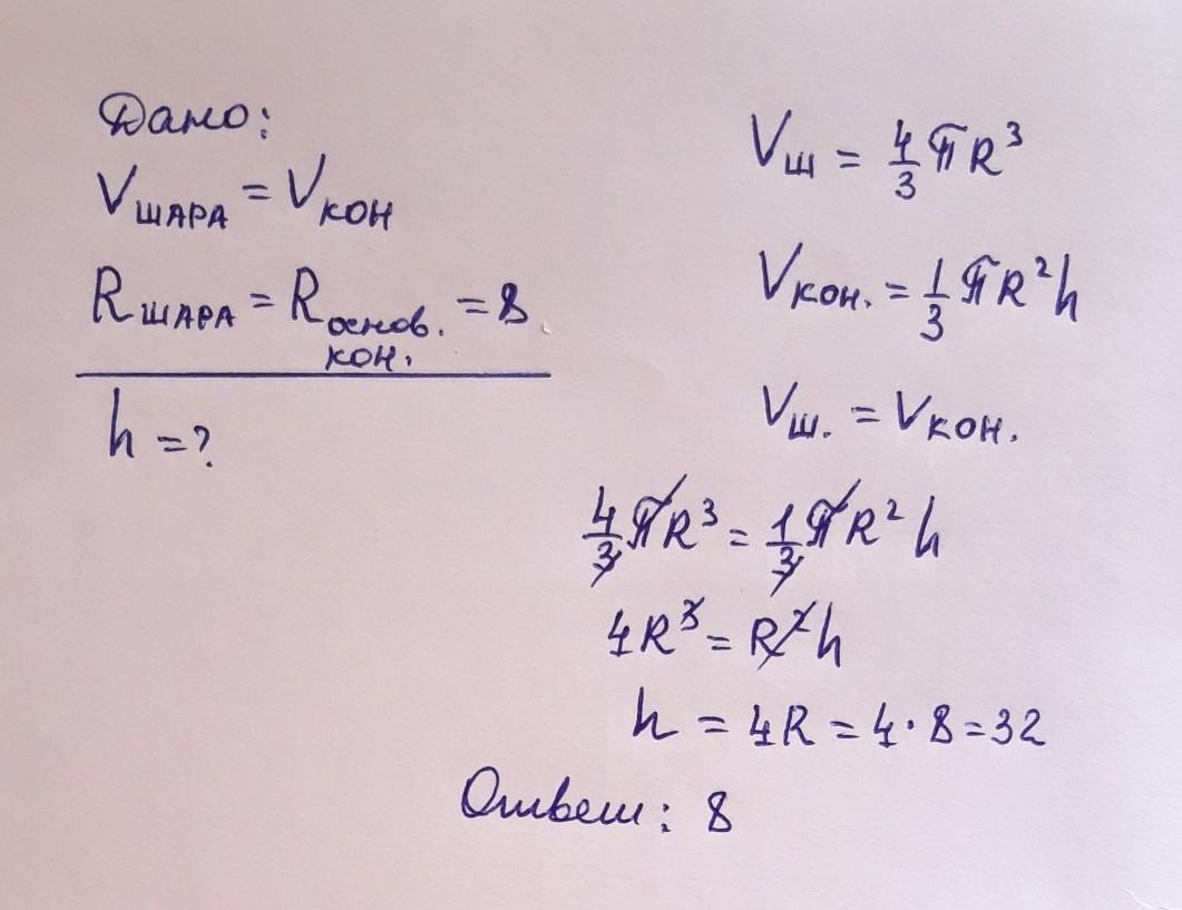 . Объем конуса и объем шара равны. Радиус основания конуса равен радиусу шара. Чему равна высота конуса, если радиус равен 8