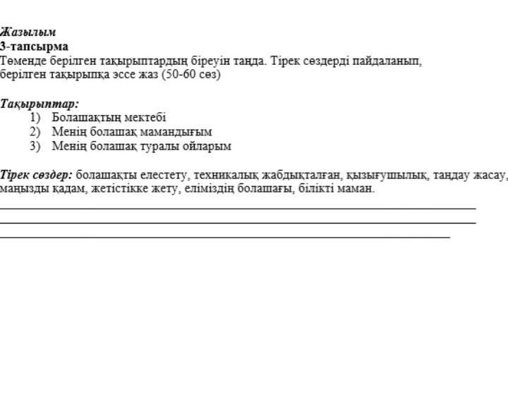 Егерде мен болашақта елестететін болсам көз алдыма сан түрлі ойлар келеді.Болашақта не істесем деген ой келеді?Кім болам?.Біздің болашағымыз яғни еліміздің болашағы өте жарқын қаншама қиындықтар мой сынбай өттік ал енді бізді жарқын болашақ күтуде.Болашақта әр адам өз қызығушылығын,өз мақсатына,өз арманы өзі таңдайды өзі шешеді.Елімізде сан түрлі білікті мамандар келесі ұрпақты даярлайды.Ал қазір біз армандап бабаларымыздың құрамыз.Бұл өте маңызды қадам!