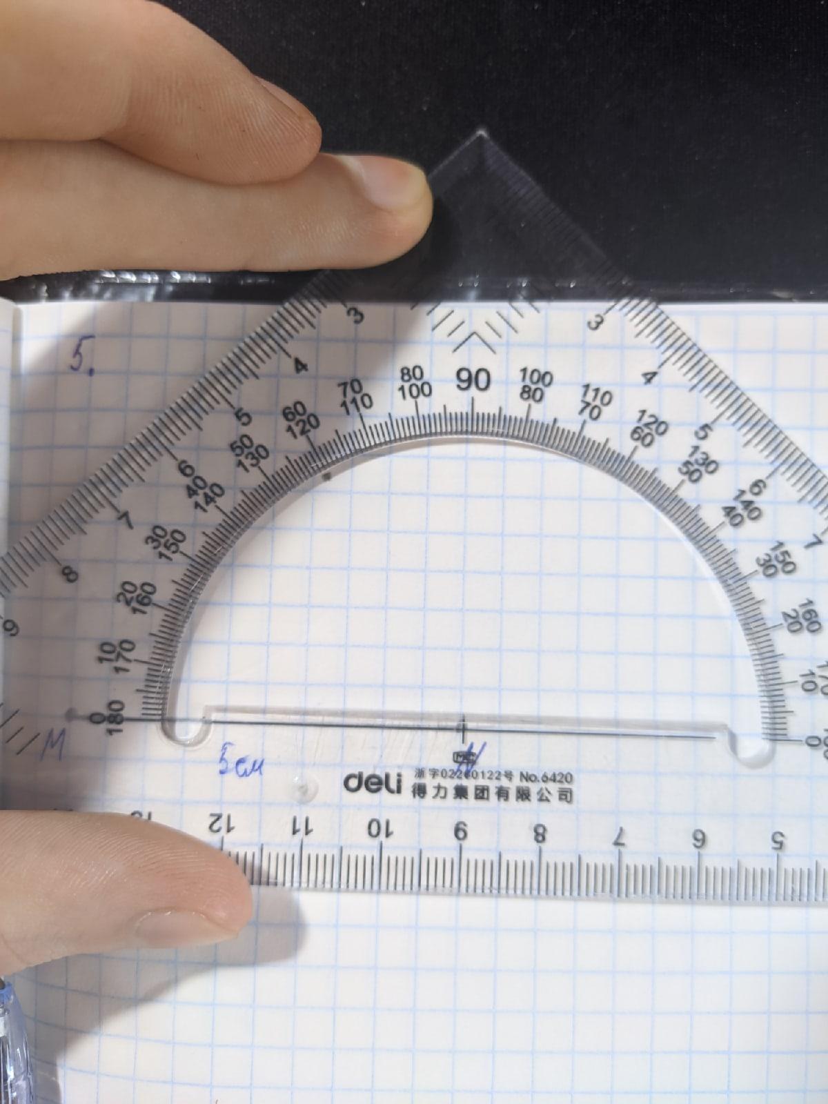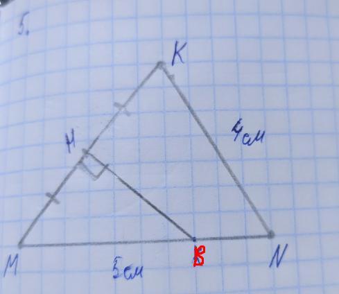 Сначала строим отрезок 5 см с помощью линейки, затем берём транспортир, отмеряем 60 градусов (как показано на приложении ниже), ставим точку на 60-ти градусах. Далее через точку N и точку, которая указывает на 60 градусов, отмеряем отрезок 4 см с помощью линейки. Соединяем точки M и K. Измеряем полученный отрезок (примерно 4.6 см получится). Делим полученный результат на два, отсчитываем полученное значение от любой из точек, отмечаем точку H так, что MH=MK. Затем прикладываем прямой угол к точке H, проводим прямую до пересечения с отрезком MN. HB-серединный перпендикуляр.