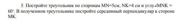 ПОСТРОЙТЕ ТРЕУГОЛЬНИК ПО СТОРОНАМ MN=5см, NK=4см и углу MNK=60°. В ПОЛУЧЕННОМ ТРЕУГОЛЬНИКЕ ПОСТРОЙТЕ СРЕДНИЙ ПЕРПЕНДИКУЛЯР К СТОРОНЕ MK. (ПОМОГИТЕ ПОЖАЛУЙСТА РЕШИТЬ)
