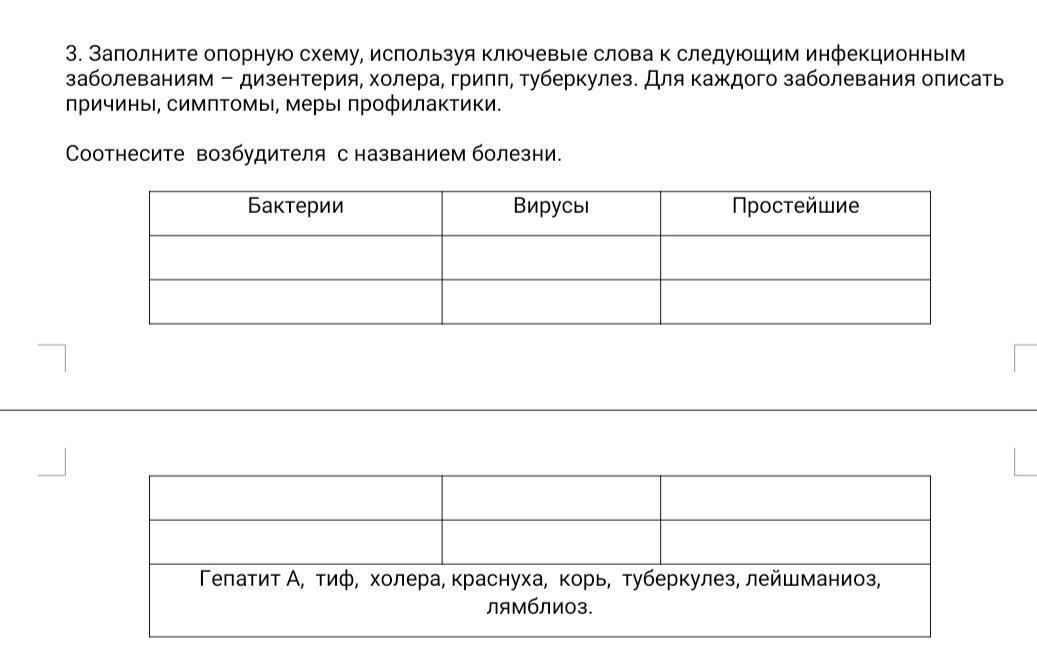 Заполните опорную схему, используя ключевые слова к следующим инфекционным заболеваниям – дизентерия, холера, грипп, туберкулез. Для каждого заболевания описать причины, симптомы, меры профилактики.