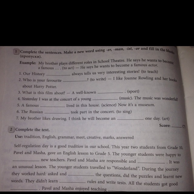 Complete the sentences . Make a new word using -er,-man,-ist,- or and fill in the blanks (пропуски)