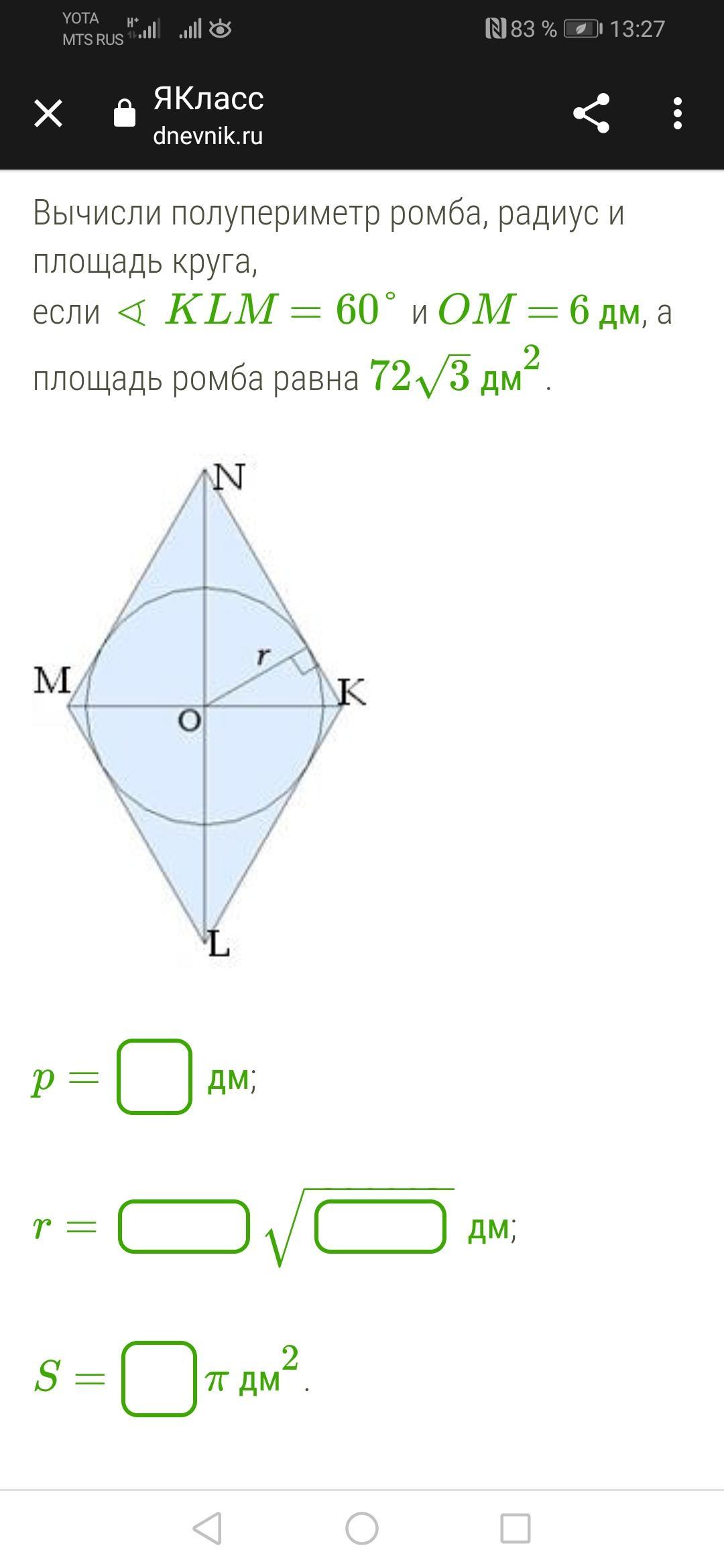 Вычисли полупериметр ромба радиус и площадь круга если KLM=60° и OM=6 дм, а площадь ромба равна 72 корень 3 дм²
